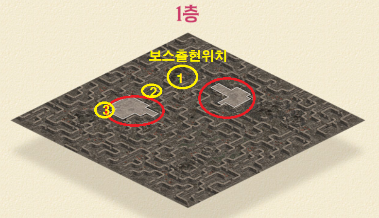 빨간색: 포그젠 지역, 노란색: 보스 출현 위치, 파란색: 입구
