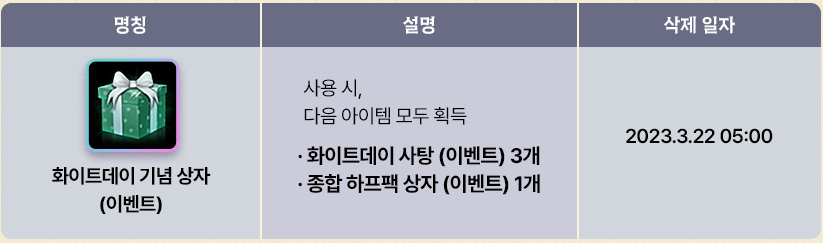 – 유료 아이템 ‘3.1절 기념 선물 상자(이벤트)’와 획득 아이템 ‘태극기(이벤트)’, ‘쓰리데이즈’ 타이틀 효과는 2023년 3월 8일(수) 정기 점검 후 일괄 삭제됩니다.