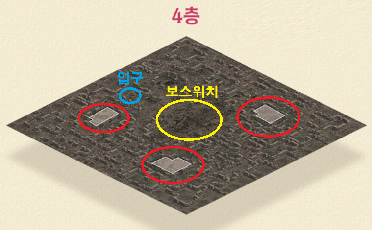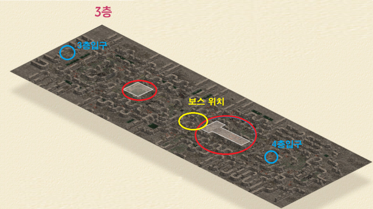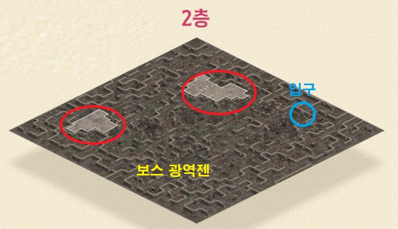 빨간색: 포그젠 지역, 노란색: 보스 출현 위치, 파란색: 입구