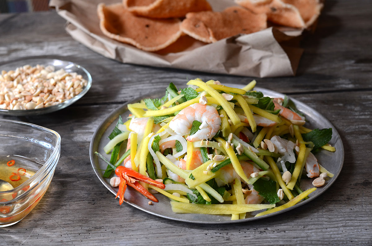 고이 소아이(Gỏi xoài) – 얇게 썬 망고, 양파, 새우, 민트, 고수 같은 허브로 만든 망고 샐러드. 생선 소스, 라임 주스, 설탕으로 만든 새콤 달콤한 드레싱과 함께 제공됩니다.