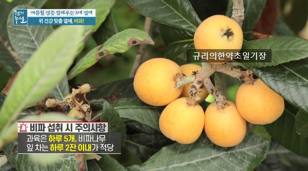 비파나무 효능 성인병 예방 카테킨이 풍부해 혈중 나쁜 콜레스테롤 함량을 낮추고 혈관의 노폐물을 배출해 고혈압, 동맥경화 등 성인병을 효과적으로 예방할 수 있다. 면역강화 성분인 아미그달린과 카로틴은 항상성 유지에 도움을 주어 체내 면역력 강화에 도움을 줍니다. 피부미용 비타민C 성분이 피부의 잡티와 활성산소를 제거하는 효과가 있어 매끄러운 피부관리에 효과적입니다. 냉각 특성이 있어 열 발진 및 습진을 예방하는 데 도움이 됩니다. 기관지 건강 기침, 천식, 기관지염 및 기타 기관지 질환 개선에 효과적입니다. 위 건강, 성질이 차며 위열을 내리고 위를 보호한다. 항암효과 아미그달린은 암세포의 발생을 억제하고, 카로틴은 각종 발암성 유해물질을 제거하여 암을 예방합니다. 눈 건강 카로틴은 몸에 흡수된 후 비타민 A로 전환되어 안구 건조증, 야맹증, 눈의 각막 연화를 예방하여 눈을 건강하게 합니다. 통증 완화 신경 세포를 강화하여 신체의 통증을 완화합니다. 삶은 비파잎이나 비파차를 자주 마시면 신경통 증상을 호전시킬 수 있다. 해독 효소와 타닌산은 우리 몸의 각종 염증을 제거하고 독소를 분해하고 배설하는 데 도움을 줄 수 있습니다. 피로회복 비타민 A, B, C, 당류가 풍부하여 피로회복에 도움을 줍니다. 수분이 풍부하여 더운 여름 땀으로 인한 탈수를 예방합니다. 간 건강은 간 해독과 숙취해소에 도움을 줍니다.