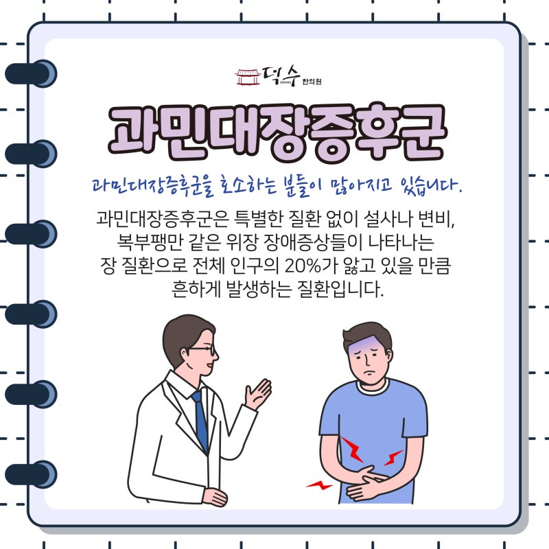 과민성대장증후군 과민성대장증후군은 특별한 질환 없이 설사, 변비, 복부팽만 등의 소화기 증상을 일으키는 장 질환입니다. 전체 인구의 20%에 영향을 미치는 흔한 질병입니다. 알 수 없는 병태가 많은데 이런 경우에는 한의학의 관점에서 바라보아야 합니다.서울특별시 한의원 덕수한의원 과민성대장증후군