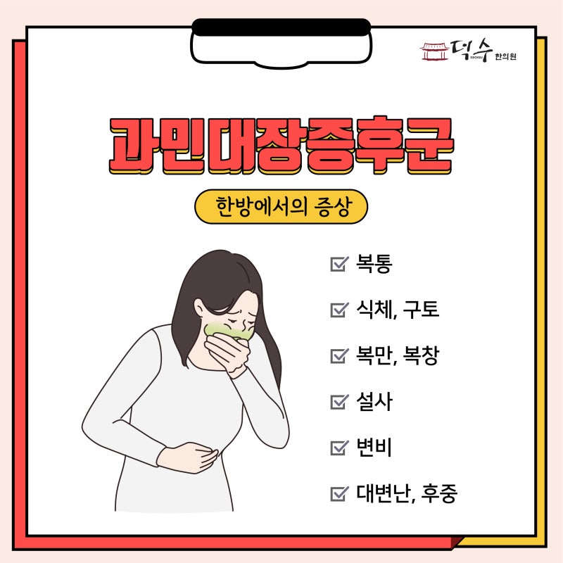 과민성대장증후군의 증상 동양의학에서 말하는 과민성대장증후군의 증상은 다음과 같습니다. 설사, 변비 등의 장질환 뿐만 아니라 복통, 소화불량, 구토, 고창, 헛배부름 등의 증상이 동시에 나타난다고 보고되어 있습니다. 원인을 치료합니다.서울특별시 한의원 덕수한의원 과민성대장증후군