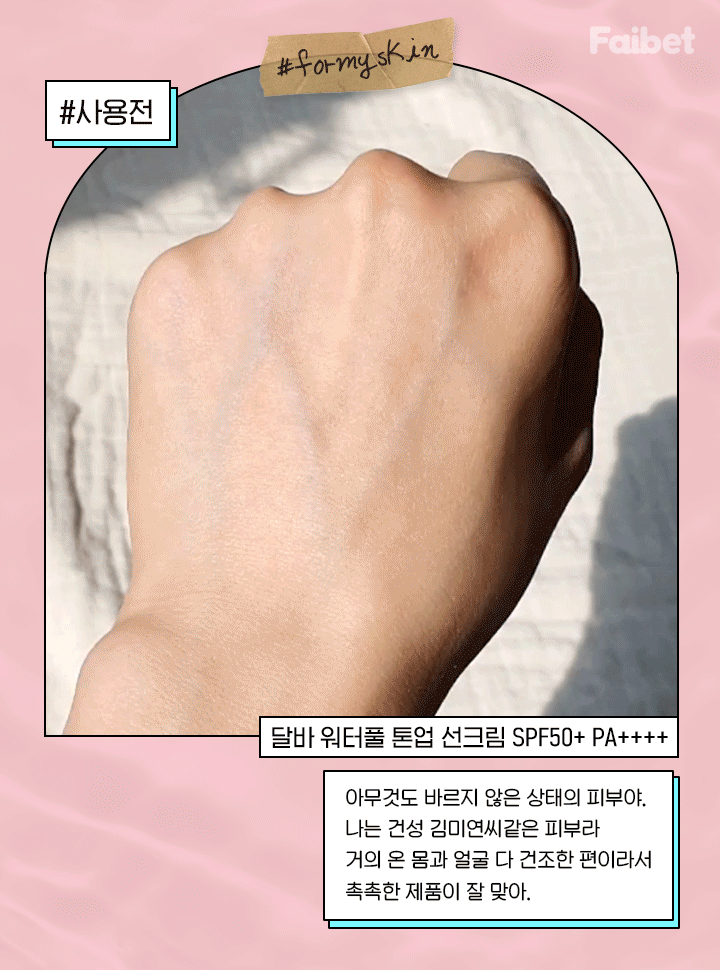 일시적인 윤기를 보여주는 것이 아니라 그 촉촉함이 오래 지속되기 때문에 달바톤업 자외선 차단제를 바르고 있을 때는 속이 당겨지지 않고 윤기있고 깨끗한 톤업을 할 수 있다는 것.