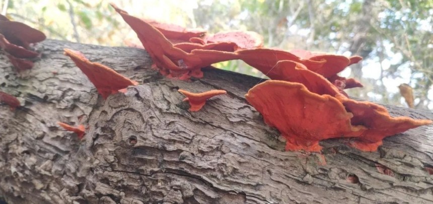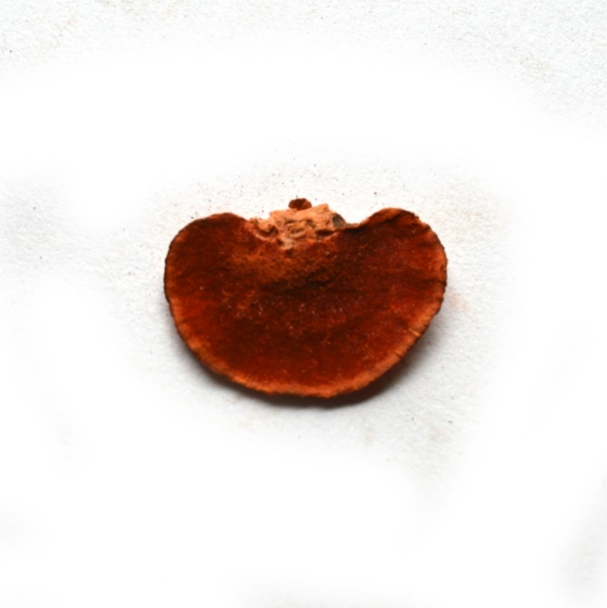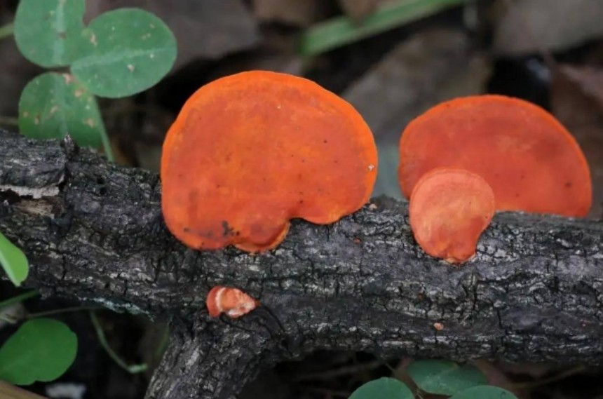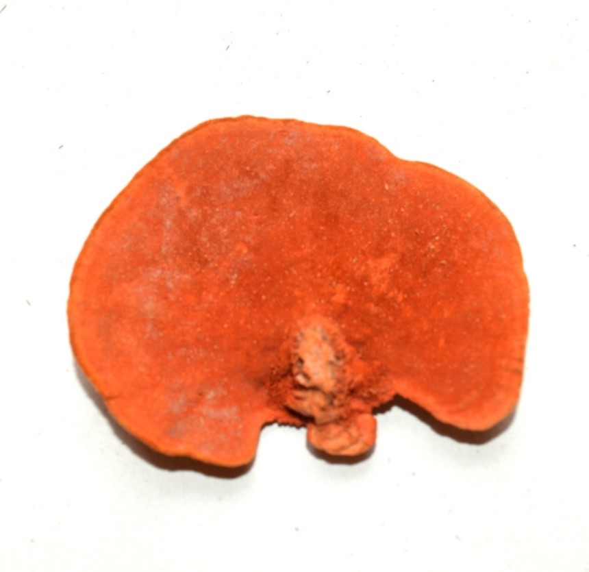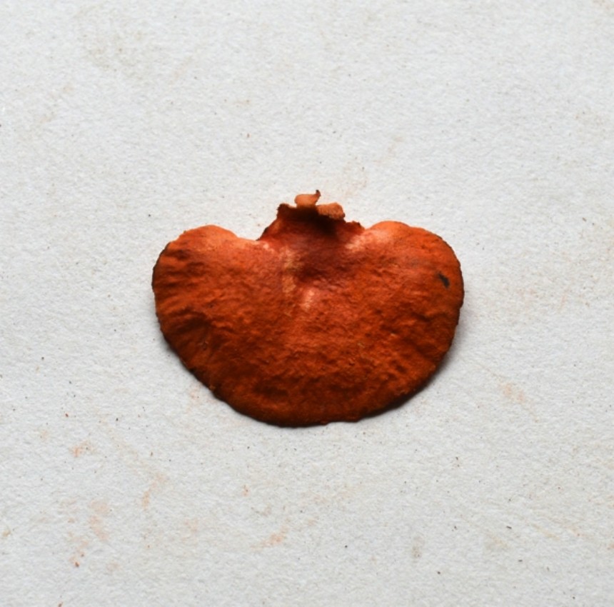 자실체는 대부분 작고 편평한 반구형이며 편평하고 고착성이며 과육은 신선하고 부드러우며 건조하고 물집이 생기고 꽃차례는 직경 2-11cm, 두께 0.5-1cm, 표면은 주황색에서 붉은색을 띠며 후기에는 약간 붉은색을 띠며 색이 바래고 검게 변한다. 균사체는 오렌지색으로 뚜렷한 고리무늬가 있고 수산화칼륨에 닿으면 검게 변하며 관의 기공 표면적은 밀리미터당 2~4개이다. 주요 특징은 자실체가 외부에서 내부로 밝은 주황색에서 빨간색이며 침엽수 및 낙엽수의 마른 가지에서 발생하며 종종 클러스터로 자랍니다.