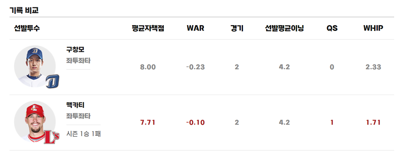 선발 구창모는 평균자책점 8.00, WAR -0.23, 2경기 선발 평균이닝 4.2, QS 0, WHIP 2.33이다. 매카티의 선발 투수는 평균자책점 7.71, WAR -0.10, 2경기 4.2이닝, QS 1, WHIP 1.71을 기록했고 시즌 성적은 1승 1패다.