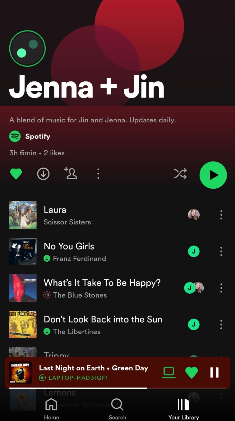 그리고 자기 전에 Jena와 이야기를 나누다가 우리의 노래 취향이 꽤 일치하는 것을 발견하고 Spotify 믹스를 만들었습니다.