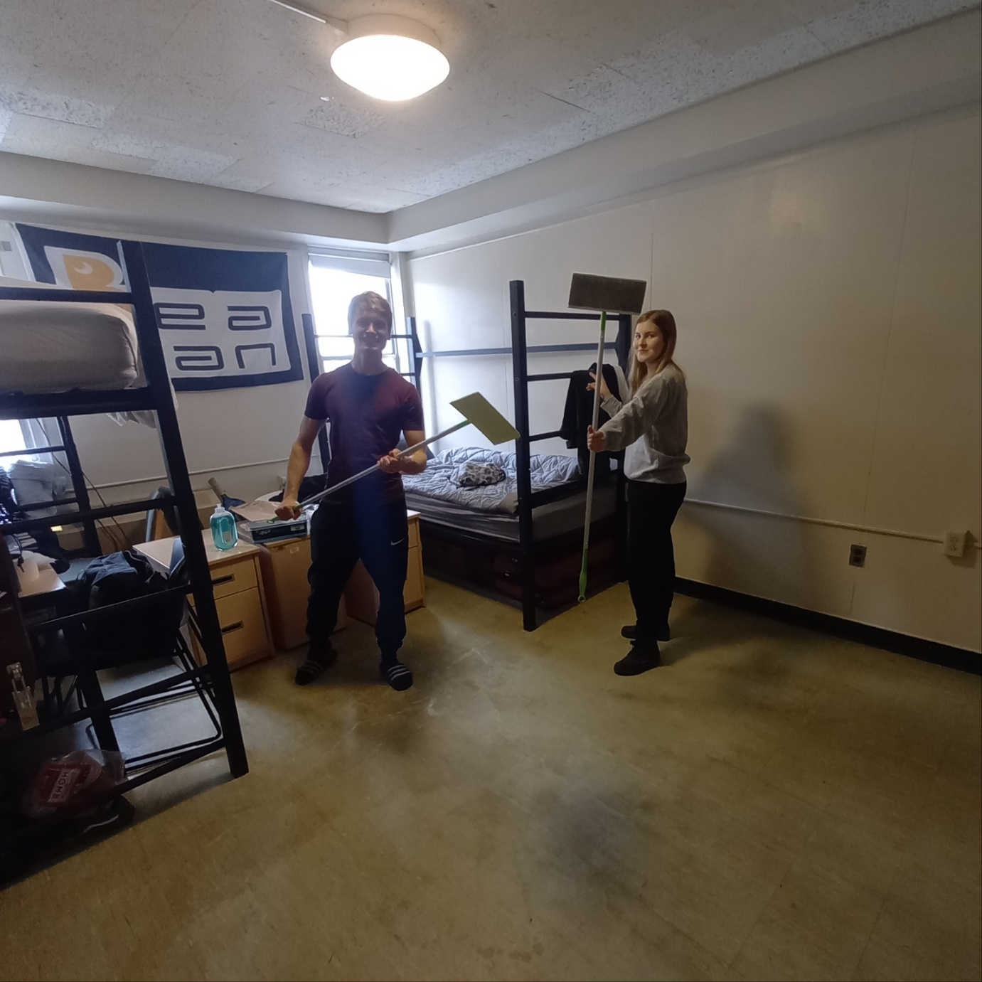 그래서 Jena와 나는 Lucas의 방으로 가서 청소를 돕습니다.