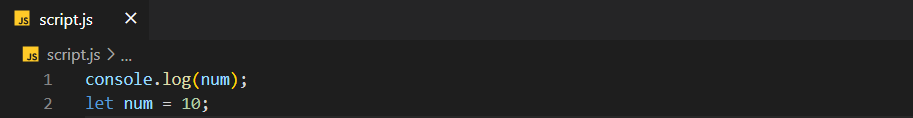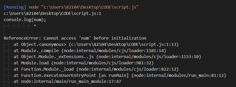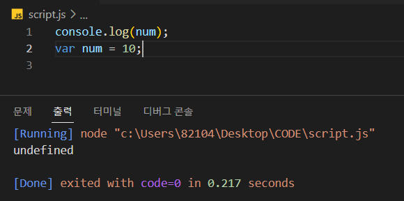 다음을 보면 변수를 선언하고 할당하는 초기화 전에 num이라는 변수를 출력합니다.